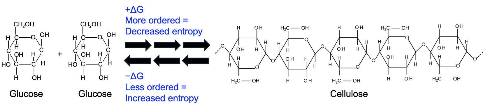 Let’s take the example of cellulose synthesis. Cellulose is formed when glucose monomers are linked with glycosidic bonds. Individual glucose molecules are much more disordered than when they are joined together into cellulose. Thus, the cellulose synthesis reaction decreases entropy, so the change in entropy is negative. When calculating ΔG, entropy is subtracted, and subtracting a smaller number makes the ΔG more positive. Thus, cellulose synthesis, and generally all synthesis reactions, are energetically unfavorable. Conversely, the reverse reaction of the breakdown of cellulose into glucose is energetically favorable because it increases the entropy.