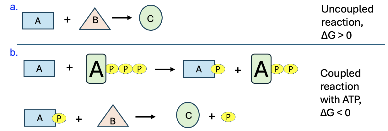 This strategy of using ATP to drive unfavorable chemical reactions is common in all forms of life and why ATP is called the energy currency of the cell. Figure 10.6 shows a generic example of the process.