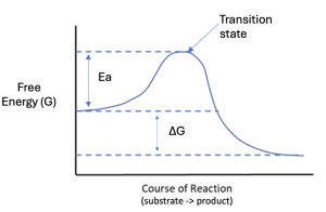 The new feature in Figure 10.8 versus Figure 10.2a is the initial energy input. This reaction requires an input of energy for the reaction to proceed. The peak energy is referred to as the transition state (Ts), and molecules must reach this transition state to proceed to form products. The difference between the transition state energy and the starting energy is that activation energy (Ea). The activation energy is always a positive value, since energy needs to be added for the reaction to occur. Likewise, the transition state energy is always higher than the potential energy of our reactants. Even if a reaction has a positive ΔG (sketch this out on your own), the Ea is always positive and the TS is always higher than the starting free energy.