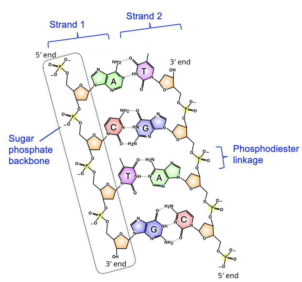 Looking at the macromolecule strands once again, notice that each strand has a free phosphate group at one end and a free hydroxyl group at the other end. These are the 5’ and 3’ ends of the nucleic acid, and the chemical differences between these ends gives each nucleic acid directionality, and we will see that strands are only read in a particular direction that is important for correctly reading the information. These names, 5′ and 3′, are commonly used to describe both individual nucleotides and nucleic acid polymers, and you will need to identify these on strands to help explain gene expression (Chapter 4) and DNA replication (Chapter 20).