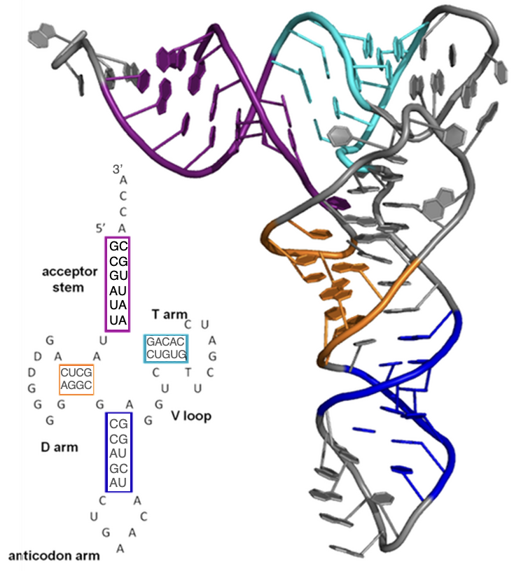 In contrast to DNA, RNA molecules in the cell are almost always single-stranded. However, as we will see in Chapter 4, RNA nucleotides base pair with DNA in the process of synthesizing the RNA. Once created, some RNA molecules (referred to as mRNA) are then used to make a protein in the process of translation. However, many more types of RNA are never translated and carry out important functions within the cell as RNA molecules (referred to as functional RNAs). Single-stranded RNA molecules often fold back on themselves using base pairing that stabilizes that folding. The base pairing rules are similar but not identical to those described above. Importantly, the ability of RNA strands to base pair within the RNA strand allows RNA molecules to have complex three-dimensional structures. Some RNA molecules can even facilitate chemical reactions much like enzymes (which are a type of protein)! Figure 3.16 shows a tRNA, which is a single-stranded RNA that plays a key role in the process of translation, or using a strand of RNA to make a protein (to be discussed further in Chapter 5). As with DNA, the hydrogen bonds between the nitrogenous bases of the nucleotides stabilize the three-dimensional structure that is essential for its function.