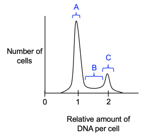 Figure 18.13 shows a typical result for a normal population of cells, and the area under the curve represents the number of cells with a specific amount of DNA. The largest peak on graph, labeled A, corresponds to many cells that have the lowest amount of DNA per cell. Then there is a population of cells with intermediate amounts of DNA (B), while a smaller peak indicates cells with the most DNA per cell (C), double the amount in the first peak.