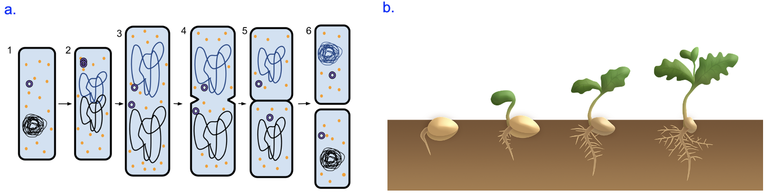 The cell theory states that all cells arise from pre-existing cells; thus, the process of cell reproduction is essential for life to continue. For single-celled organisms like bacteria, cell division (by binary fission) is how more bacterial cells are made (Figure 18.1a). Multicellular organisms, such as animals and plants, start as fertilized, single-celled eggs that undergo many, many rounds of cell division (by mitosis) to reach their mature states (Figure 18.1b). Additionally, multicellular organisms use cell division to replace worn out or damaged cells.