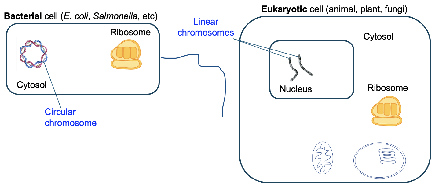 This chapter will focus mainly on the eukaryotic cell cycle, which is the series of steps by which eukaryotic cells divide. While eukaryotic cell division follows the same general process as binary fission of bacteria shown in Figure 18.1a, the process in a eukaryote is much more complex and regulated. The most obvious complication of eukaryotic cell division is due to the different organization of genomic DNA in eukaryotes. Instead of the single, circular chromosome found in bacteria, eukaryotes have their genes in linear segments of DNA, each of which is a chromosome (Figure 18.2). To produce genetically identical daughter cells, each of these chromosomes needs to be replicated and accurately divided among daughter cells. We will learn in Chapter 19 how these processes are controlled and regulated.