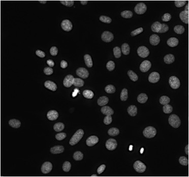 Up until this point, we have been focused on single cells, and the changes to DNA and other molecules in that one cell over the course of the cell cycle. However, it’s very difficult to track the DNA and other features in a single cell. Instead, we find it easier to study populations of cells, usually thousands to millions of cells. Within these populations, cells may be in different phases of the cell cycle, if they are dividing at all. Figure 18.12 shows cells that were grown in the lab and stained with a dye that fluoresces when in binds to DNA, so we are just seeing the nuclei of these cells. We can see that some nuclei are brighter than others, indicating different amounts of DNA or different densities of DNA, which correspond to different phases of the cell cycle.