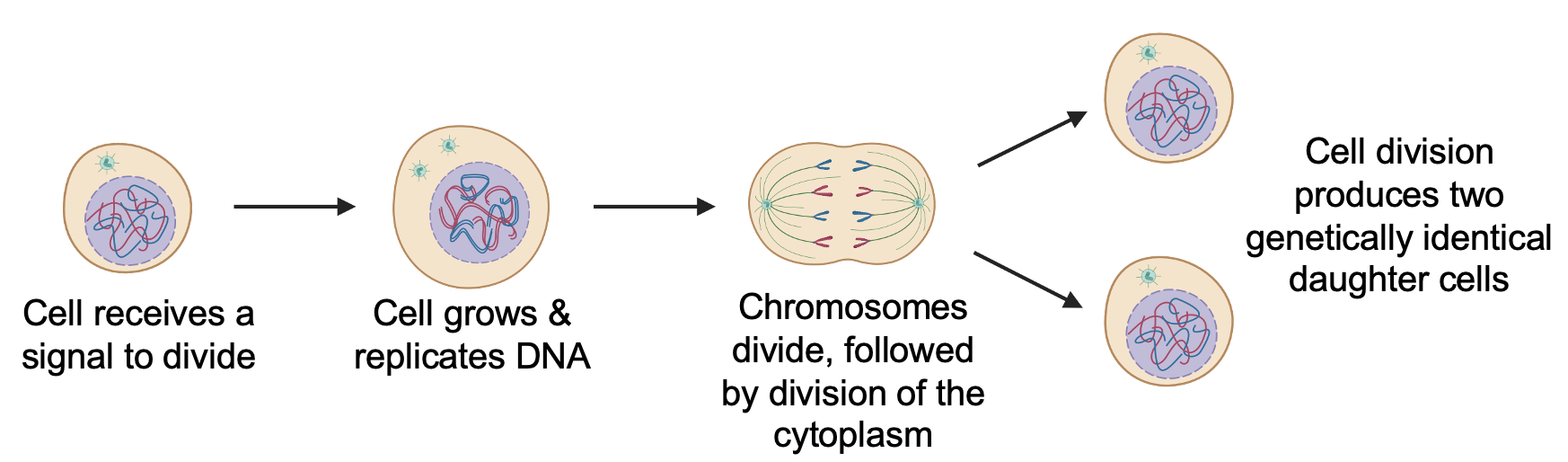Cell division—the process of one cell becoming two cells, each genetically identical to each other and to the original (parent) cell—is one the most complex and radical events in the life of a cell. To carry out cell division, a cell needs to create a copy of its entire DNA sequence (DNA replication), and ensure there is enough membrane, proteins and ribosomes to divide among the new (daughter) cells. Cell division in eukaryotic cells is additionally complicated by the need to create more organelles, break down and reform the nucleus, and accurately divide numerous segments of DNA among daughter cells. All of this requires extensive new gene expression, energy, and regulation to ensure the cell division process works correctly and under correct the circumstances. If something goes wrong in the cell division process, it could result in cells that can’t survive (non-viable), or cells that divide abnormally, leading to cancer.