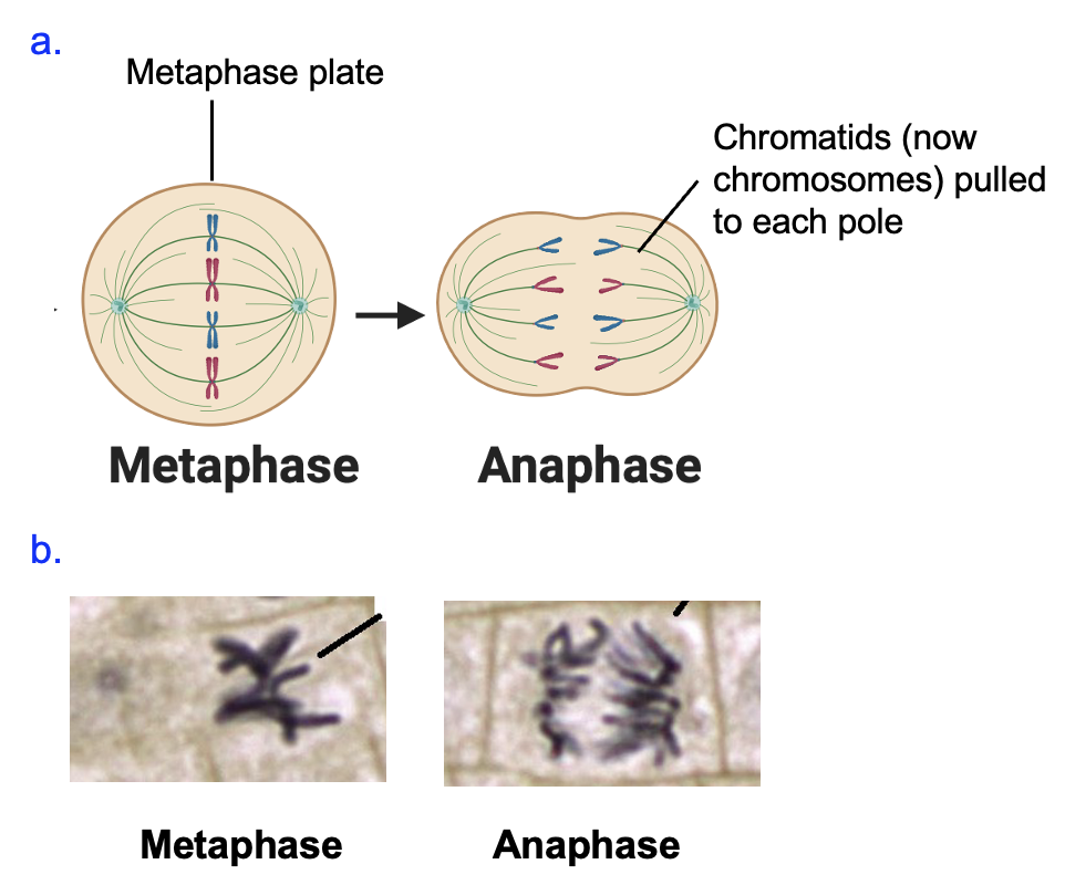 This attachment on both sides of the chromosome (one pole attached to one chromatid, the other pole attached to the other chromatid) results in the movement of chromosomes to the middle of the cell (Figure 18.10, left cells). This alignment of chromosomes in the middle of the cell, caused by the lengthening and shortening of spindle fibers attached to chromosomes, is called metaphase. The correct attachment of chromosomes to the mitotic spindle leads to the destruction of the cohesin proteins connecting chromatids of a chromosome, allowing each chromatid to be pulled by its spindle fiber to the poles of the cell. One sister chromatid goes to one pole, and the other chromatid to the other pole. This movement of chromatids apart from each other is anaphase.
