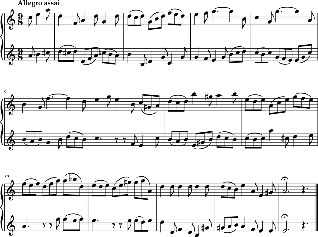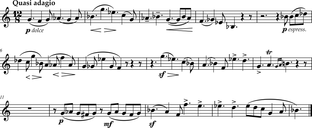 Exercise 2B-8 features a singular duple (i.e., simple-meter) division of the beat on the downbeat of measure 12. We will discuss moving between duple and triple beat divisions in Chapter 4, so for now, you can imagine a different rhythm for that beat, attempt it as-is by placing the second duplet exactly between the second and third eighth-note beat division of the bar, or listen to a few recordings and imitate what those performers do. Notice the second half of the tempo marking, which translates to “with some freedom.”